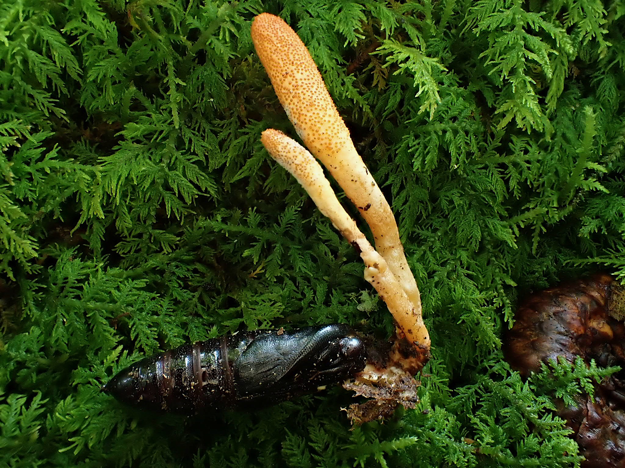 I stumbled across the bright orange fruiting body of Cordyceps militaris during my first day of work at Southern Highlands Reserve, in the lower moss bank. Gently, as to not disturb the cadaver or the moss, I dug down until I felt the chitinous body of a pupating moth. These photos are of a Lepidopteran host and the result of its fungal fate. Some might find the parasitic nature of these fungi too much to stomach, but life and death in the mountains never stagnate and ultimately lend themselves to the same creative force. To study the ghostly, the ephemeral, and even the macabre inspires entirely new vision of the natural world around us.